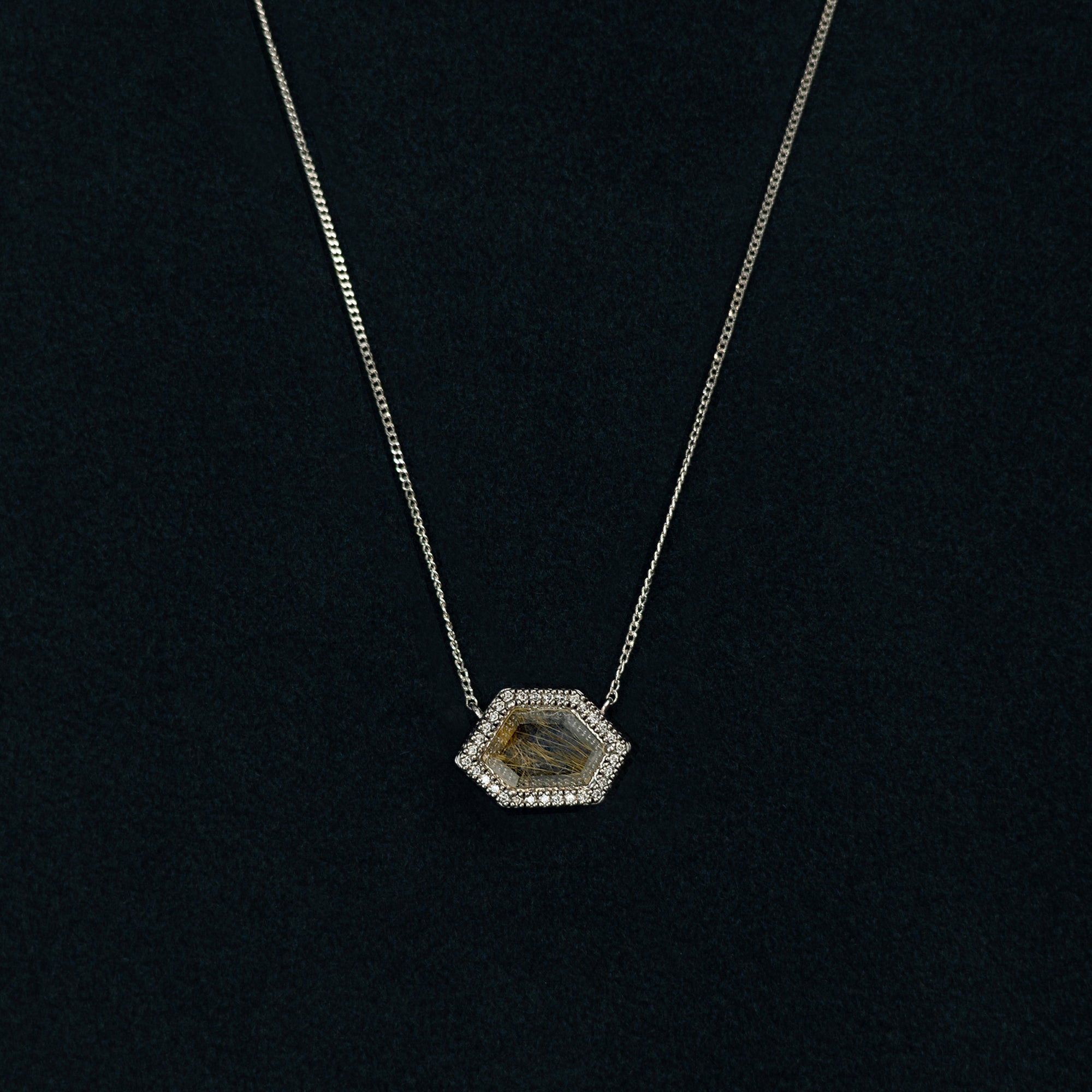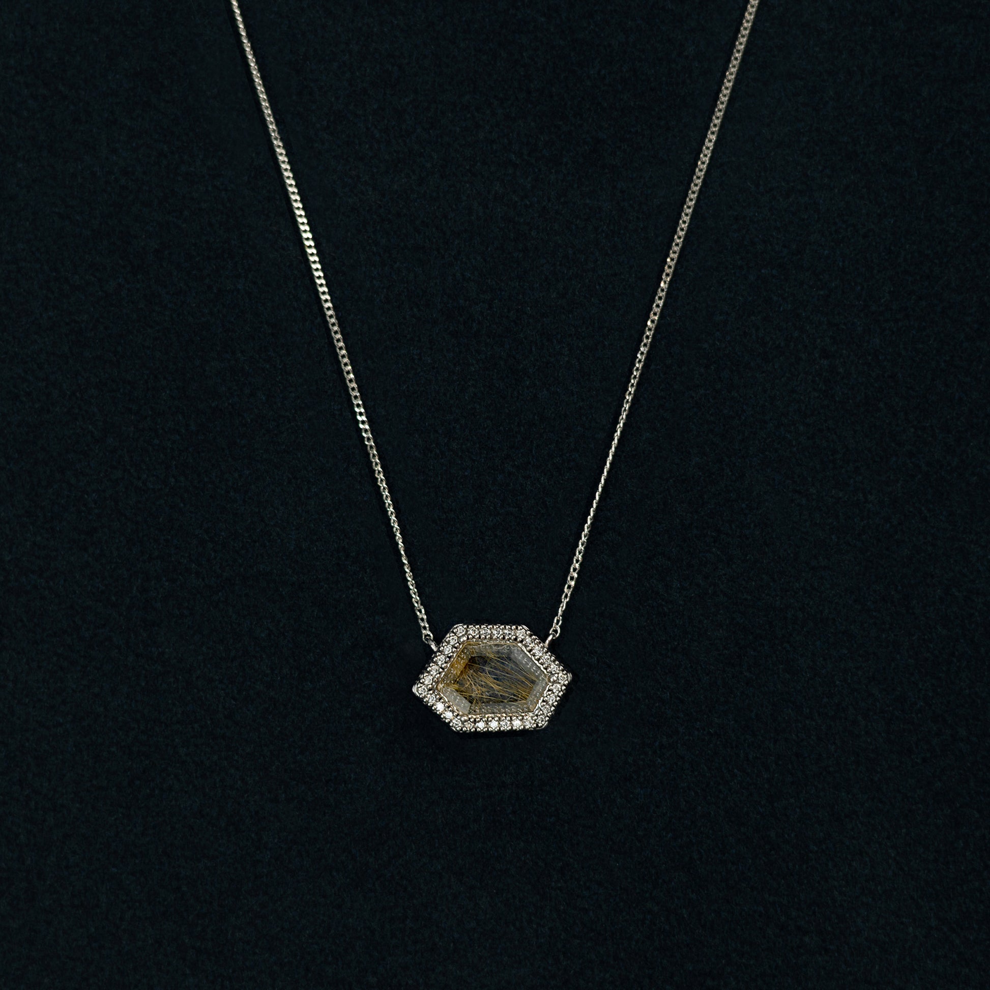 Stone: 12x9mm Rutiled Quartz, 1.1mm Moissanite